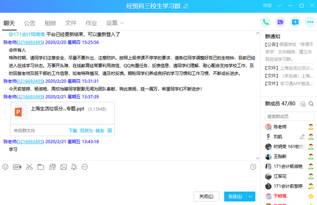 为认真贯彻落实学校疫情期间的防控要求,经贸一组各班级班主任第一时间通过微信、QQ等途径向各班级学生与家长发放了学校下达的各项文件,并督促学生加强学习,认真落实,做好寒假期间及春季开学初学生的居家健康教育,积极宣传普及疫情防控知识。同时,班主任每日组织学生在各班级微信群对学生身体健康情况进行统计汇报,严格落实学校防疫情况日报告制度和相关具体要求。
