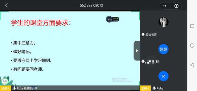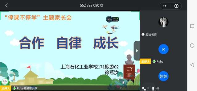 为了总结“停课不停学”网上授课的阶段性工作,了解学生在家学习生活状况,解决家长面对孩子网上授课的困惑, 171旅游02班于4月5日晚上7点整在“腾讯会议”平台召开了一次以“合作,自律,成长”为主题的线上家长会,会议由班主任徐燕汝老师主持,特教负责人殷洁老师也参加了本次会议,各位家长积极参加会议。