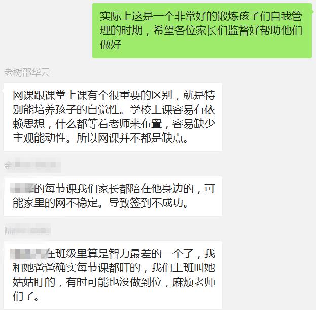 首先,与各位家长就网课开展以来学生是否准点上课、是否及时上交作业的问题展开了讨论,家长们看到孩子的表现后积极与班主任老师交流出现问题的原因,班主任老师也根据家长反映的情况给出了合理的建议,家长与老师交换了意见,这极大地促进了下一步的网课学习。