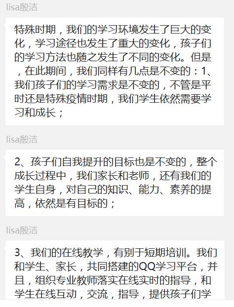 其次,邵老师介绍了如何在疫情下进行心理调适以及技巧;李老师也介绍了疫情期间家长对有自律的学生与不自觉的学生该如何作为的方法,如何配合老师管理好学生的学习,同时也给家长提出了一些合理的建议。班主任老师再三强调,根据疫情防控的需要,学生网课还得持续一段时间,如果别的同学都在一天天进步,而你的孩子还在原地不动就相当于是退步。所以,学生、家长对待网课,态度认真是必须的,不论线上还是线下课堂,对待学习都应该是始终如一的态度。