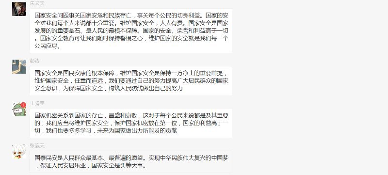 在特殊时期,各班结合班级情况,通过线上QQ平台和腾讯会议平台等进行此次的主题班会。利用PPT和视频展示生动鲜活的实例,讲解了国家安全与我们的关系,让学生对《国家安全法》《反恐怖主义法》等法律法规常识进一步了解,切实提高国家安全意识,增强国家安全责任,形成维护国家安全的强大社会共识,使同学们更进一步体会到国家安全的重要性。同学们积极回答主持人提出的问题,主动发表观点。只有国家安全,我们才能安居乐业,有力地促进学校学生的思想道德修养建设,提高我们的国家安全意识。很多同学表示,国家安全是国民安全的基本保障,都希望将来能为国家做出力所能及的贡献,为国争光……