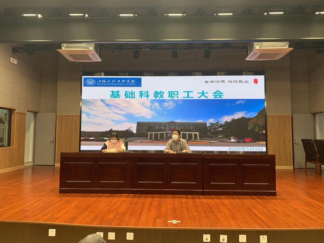 为迎接我校学生全面返校,确保本学期复学复课工作顺利进行,基础科于2020年5月9日14:00在会议中心召开了全科教师大会,科长邵宝勤主持本次会议,党支部书记于燕娜以及基础科全体教师出席会议。