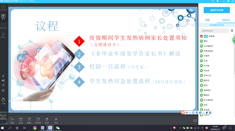 2020年5月13日,化工辅导二组班主任在学习好相关开学复课精神之后,利用晚上学生家长都下班的契机,召开了网上家长会,由于该会议也牵涉学生复课后的一些注意事项,所以也邀请同学们一起参与了此次意义非凡的云端家长会。