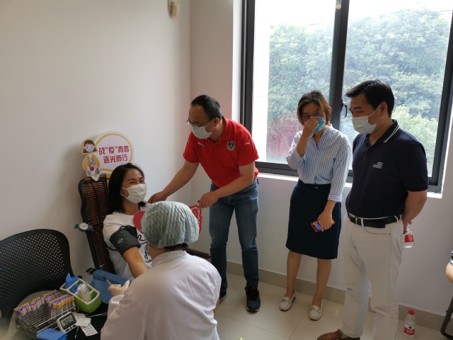 6月30日我校顺利完成2020年无偿献血工作,16名教职工在抗击新冠病毒肺炎疫情期间,克服各种困难,分三批完成了今年的献血任务。我校党委书记林国新、校长高炬、副校长黄汉军和工会主席迮育彪亲自陪同,为献血教职工鼓舞士气。献血同志和陪同人员均严格按照“车辆消毒、保持安全距离、全程戴口罩、自带茶杯和水笔、测量体温、健康征询及健康检查”的采血流程,在医务人员的指导下,有序填写资料、测量身体指标、抽取血液。