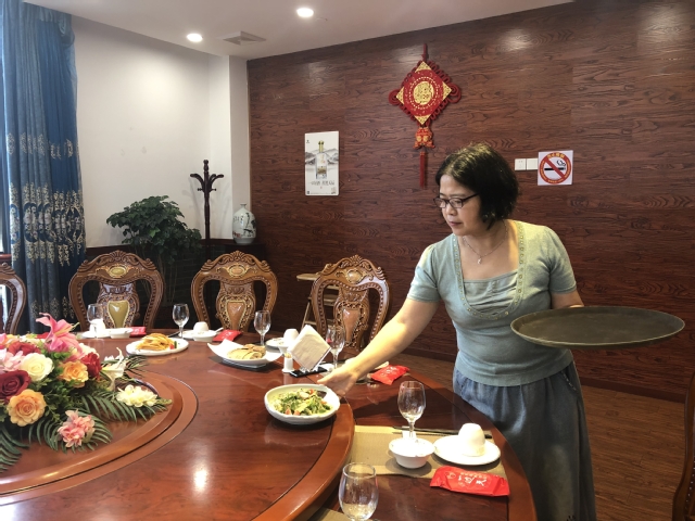 上海一边天餐饮管理有限公司负责人莫经理热情接待了各位教师。他向各位教师介绍了企业的情况,并根据洽谈初期教师的需求,设置了不同的岗位,安排了各个岗位的带教师傅。主要实践岗位有:迎宾服务、领位服务、餐厅服务(包含中餐摆台、点单、上菜、斟酒等)、宴会服务、及新设置的茶艺服务等。莫经理提前知道有6位教师来自商务英语组,于是在除了传统的餐饮实践岗位之外,他又设置了前台服务(包含电话订餐、网络接单和收银等)。为了教师能够尽快适应岗位,莫经理安排了领班对各位教师进行为期五天的岗前培训,即日开始。