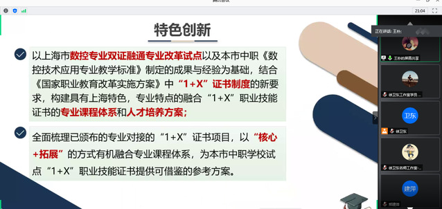 在工作室主持人、课题负责人、上海石化工业学校正高级讲师徐卫东老师介绍了与会评审专家及课题组成员后,由工作室学员、上海市高级技工学校王朴老师介绍课题开题报告,主要围绕研究背景与现状、研究目标与任务、课题特色与创新、研究成果与应用四方面进行重点汇报,对梳理1+X职业技能等级标准与专业课程的对应融合关系、构建涵盖“1+X”职业技能等级标准要求的基于“能力域”的数控专业人才培养课程体系研究解决的核心问题进行了分析。汇报思路清晰、核心明确、图文并茂,呈现了课题组的研究思路,赢得了专家的一致肯定。