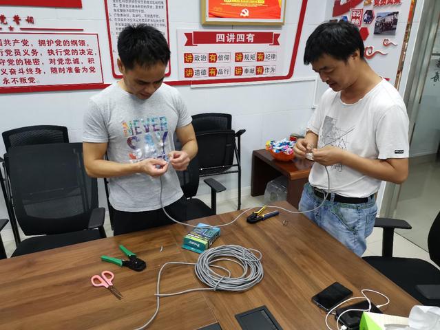 通过学习,老师们基本了解了城域网的一般组网结构,作为组网主要设备的接入交换机、汇聚交换机、核心交换机的主要国内品牌、型号、性能等相关知识。俗话说得好“纸上得来终觉浅”,作为教师暑期下企业实践的目的和初衷就是磨合教师的理论教学和实践教学的结合能力,提升教师的实践操作水平,拓展教师对新领域、新设备、新知识的认知。带教师傅们就从组网设备间常用的连接介质——双绞线的制作开始,讲解了双绞线的类型、直通线和交叉线制作的方法和要点,并且耐心地指导我们动手操作,直到我们都能熟练完成且测试成功。