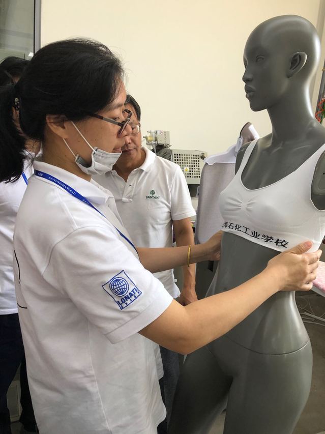 在熟悉了圣东尼研发中心环境后,我们在岑老师的带领下正式开始体验打样制版岗位的工作流程:了解电脑提花无缝单面内衣机TOP2FAST设备的特点,设计适合本设备的打样制版的式样;使用打样制版软件“photo SANTONI”设计样品;下载程序上机自动编织;编织完水洗、蒸烫定型;裁剪与缝合;模特上身检查样品尺寸是否合适;调整软件参数最后得到满意样品。