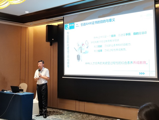 成果展示环节,黄汉军做了《专业国际化建设工作与思考》主题报告,介绍了引进AHK证书的目的与意义、化工专业国际化之路、“AHK化工工艺员”本土化进程等方面内容。东营职业学院刘德志和我校严小丽分别展示了《工艺参数测量》与《化工职业通识认知》教材及工作页。与传统教材相比,基于AHK标准的教材融入了安全、规范、团队协作等要素,更注重学生综合职业素养的养成。教材配套开发的数字化资源受到AHK和各院校长的好评。