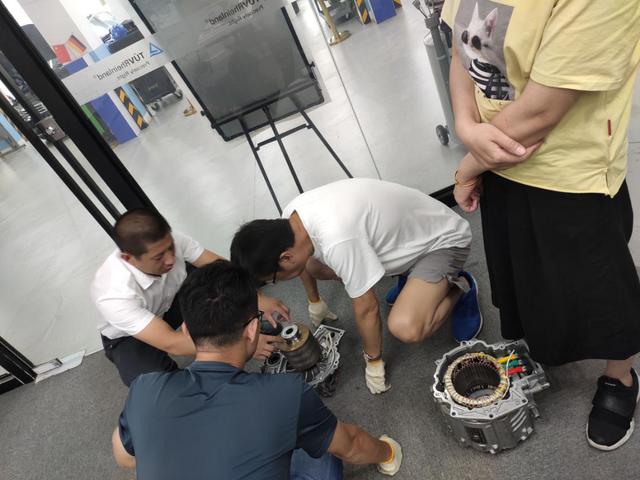 以一辆北汽新能源汽车和一辆比亚迪新能源汽车为例,企业教师为大家介绍了新能源汽车的高压系统识别、动力电池系统结构认识、驱动电机系统结构拆装与识别,在介绍过程中采用“先看(企业教师借助实体汽车详细介绍各部分的结构、联系及功能)→再画(我校教师根据现场企业教师的介绍分组画出结构图)→后评(两组对调进行互评,肯定对方的作品并指出对方的不足,两小组分别派代表进行讲解,企业教师进行点评)”,同时在讲解过程中尽可能的让教师自己动手拆装并试图解释,真正实现“边训边学、边做边学”,大家都受益匪浅。