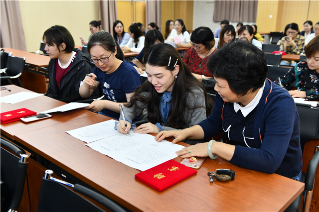 接下来就是庄严的师徒签约。9位见习期青年教师、5位培养期青年教师以及4位新班主任与各自的指导教师完成了《带教协议》的签名结对,共同见证了这一神圣的时刻。