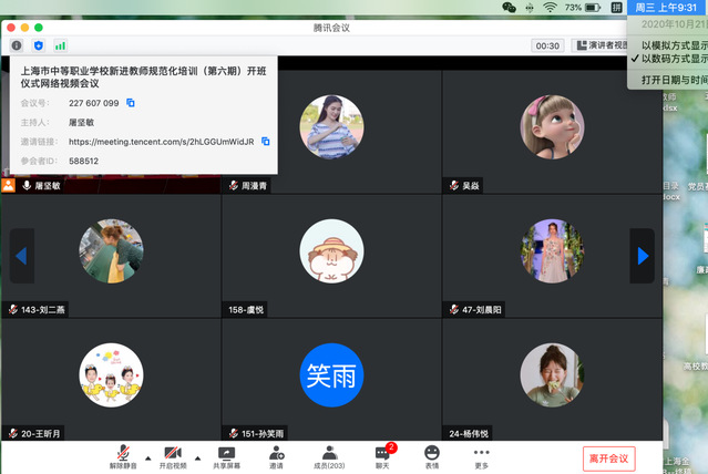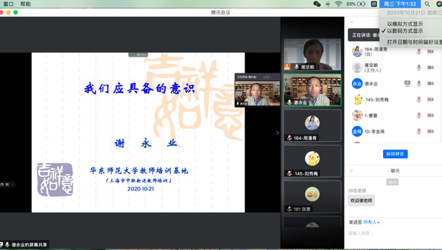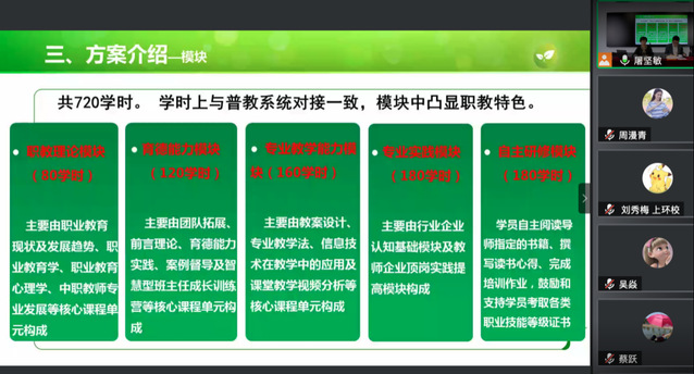 为促进上海市中等职业学校新进教师专业成长,帮助新进教师更好地完成职业适应和角色转变,由上海市教委教育技术装备中心组织的中等职业学校新进教师规范化培训(第六期)开班仪式于2020年10月21日如期举行,会议采用线上形式,上海市教委相关领导、各基地负责人、市优秀带教教师、全体新进教师参与了本次会议。