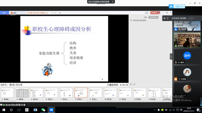 陈默老师接着上周的内容,分别从家庭功能失调、孩子创伤经历这两个方面为我们讲述了职校学生心理障碍的成因。陈老师通过鲜活的实例和直白的话语,通过正反对比案例,让我们实实在在感受到当前我们的中职孩子心理障碍与家庭结构、教养、关系、母亲情绪、经济状况以及孩子受到抛弃、虐待、忽视等有着极为重要的联系。作为中职学校的教师,我们要提升自身的软实力。首先是要发自内心地热爱我们的教育事业,其次是一定要有高情商和敏锐的觉察力去应对中职学校学生的问题。