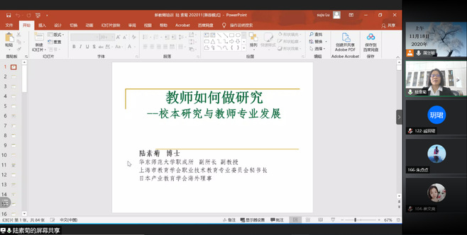 2020年11月18日,华东师范大学职成所副所长、副教授陆素菊博士为新教师开展了一场名为“《教师如何做研究》——校本研究与教师专业发展”的云端讲座。