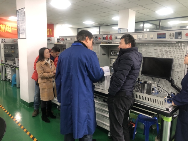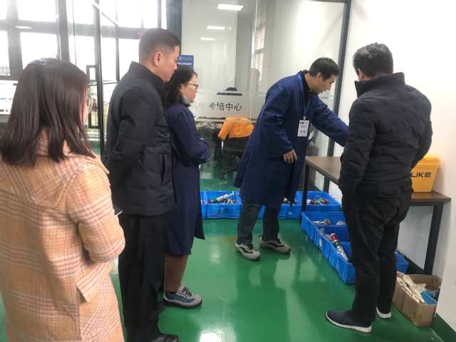 1月6日,圣东尼(上海)针织机器有限公司首席知识官李长乐、人力资源总监王百炼、校企合作专员林国权、企业班主任朱海华来访我校,观摩合作培养班级181机电(圣东尼国际班)正在进行的AHK机电一体化工毕业考试一,同时对后续针织行业国家培训鉴定中心的筹备工作进行了讨论。