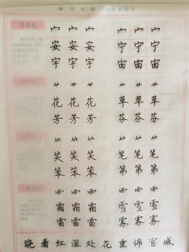 首先提高学生对字的间架结构的认识。本学期从练习基本笔画开始,着重发展学生对字的间架结构的学习。每次上课,选一些具有代表性结构的字,尽量让学生来分析每一个字的结构特点和书写注意点,老师再作适当的补充,让学生能独立地发现字的书写规律,有助于学生对同类字的书写。其次培养学生临贴能力。每过一两周,老师就要求学生临写钢笔字帖,进行点评,要求学生能说出自己的字和字帖里的字比较相近的地方,并提出哪些地方临得不好,然后教师进行点评和补充教学。使学生明白临帖的方法和技巧,在以后的独立学习中能得心应手。在教学中,教给学生写硬笔书法作品的方法、方式,以及书写的技巧,引导他们平时多练习,养成良好书写习惯。这才是开展社团课的初衷。
