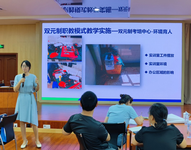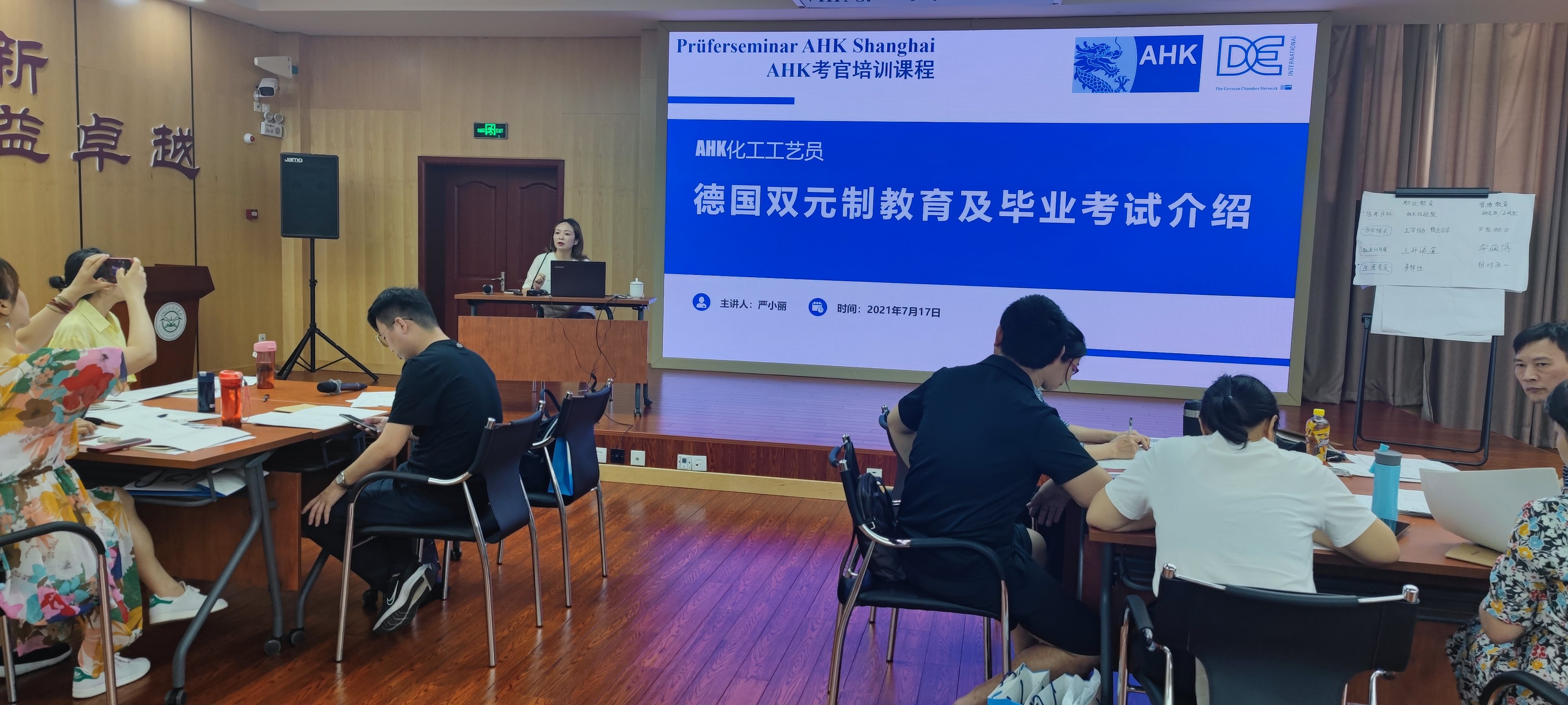 第一天下午由AHK委派的吴敏老师为大家进行授课。吴老师分别从双元制考培中心的工作环境、AHK考证过程、考试委员会在地方的组建和主要职责等双元制模式教学实施过程进行系统地介绍。除此之外,吴老师还针对AHK考试规则与流程分享了自己作为AHK考官的经验,使学员深入了解AHK化工工艺员毕业考试工作的前期准备、过程实施及结果评定等事务。