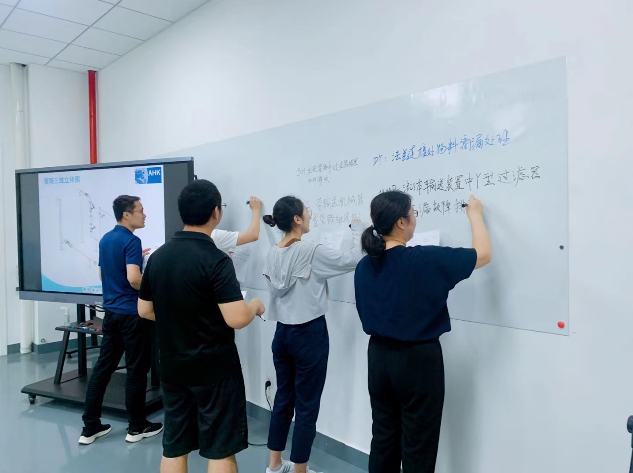 第三天和第四天分别由AHK委派的高文杰和胡迪君老师开展《工艺技术和生产技术基本操作》和《设备技术装配作业》实践模块的培训。两位老师都完整地演示了实操考试过程,并以小组讨论的形式组织大家制订考核评分标准。在实训过程中,学员们按照小组内制订的标准亲自操作,为后续各职业院校开展与实施AHK考试积累了宝贵的经验。