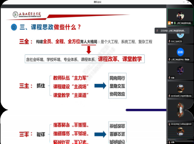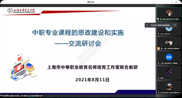 为了进一步提升工作室成员课程思政能力,2021年8月11日晚上19:00-21:00,徐卫东导师携本组学员参加了上海市程春红名师培育工作室线上专题活动,本次活动主题是上海工商信息学校程春红老师主讲的《匠心匠艺 融合发展—中职专业课程的思政建设和设施》,活动由程春红工作室学员张老师主持。