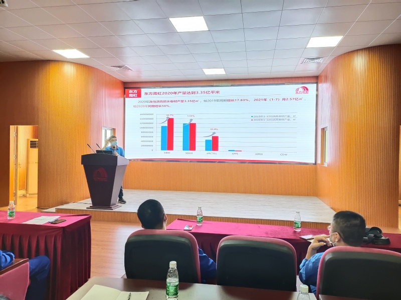 首先,东方雨虹的中级工程师周昊向化工科教师介绍改性沥青防水卷材产品知识。周昊主要从防水卷材认知与现状、东方雨虹产品体系和产品优势与施工三方面进行详细讲解。他指出,目前东方雨虹的卷材主要包括弹性体(SBS)改性、塑性体(APP)改性、超低温改性等方面,可以不同客户的各种需求。周昊强调,在防水卷材的生产工艺主要包括配料、涂覆、冷却、包装、检测、入库,其中最主要的是配料和冷却过程。最后通过观看视频方式,让老师们更直观感受防水卷材的施工过程。