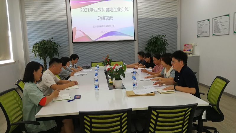 处暑过后,暑假接近尾声,机电科教师企业实践即将结束,2021年8月27日,机电科数控应用组吴彩君、王永清、张慧英、汤豪杰、陆秀林、刘文文,以及智能控制组周伟倩等七位老师,在上海普锐赛司实业有限公司会议室,对本次2021专业教师暑期企业实践进行总结交流,一同参会的还有上海普锐赛司实业有限公司副总经理朱卫卫、人事资源部经理朱冬梅。