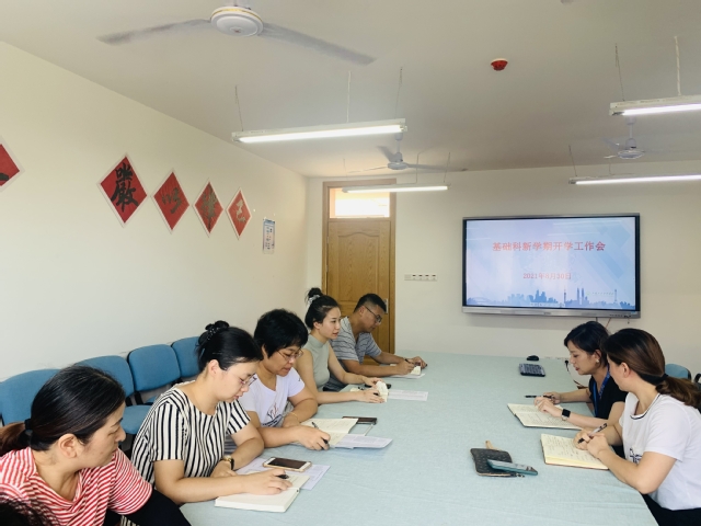 烈日灼灼、草木葱茏,新学期如约而至,为了更好的统筹和安排本学期的各项工作,2021年8月30日12点15分基础科在C区407召开新学期开学工作会,科长蒋方平、支部书记于燕娜以及各教研组组长参加本次会议。