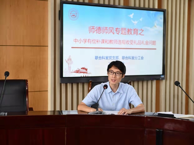 联合科室党支部书记刁小伟以“中小学有偿补课和教师违规收受礼品礼金问题”为主题,围绕“文件学习、警示教育、概念界定及践行践诺”四个方面和大家共同学习了开展中小学有偿补课和教师违规收受礼品礼金问题专项整治工作的在重要性和突出问题。