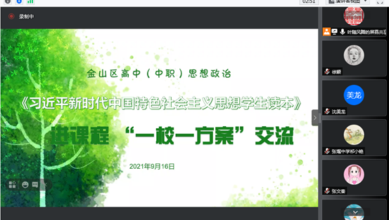 为深入推动习近平新时代中国特色社会主义思想进教材、进课堂、进学生头脑,金山区教育学院高中思想政治学科组根据《习近平新时代中国特色社会主义思想学生读本》培训的通知要求制定了相应的培训方案。方案分为四个模块,前期已经完成了三个模块的学习,9月16日下午开启了第四模块关于《读本》教学设计分组实践和分享的研讨。金山区八所高中及中职校按顺序进行了汇报,我校德育教研组黄悦、王瑞阁老师参与了此次教学设计分组实践和分享,学校全体德育老师在线聆听了此次研讨活动。