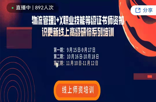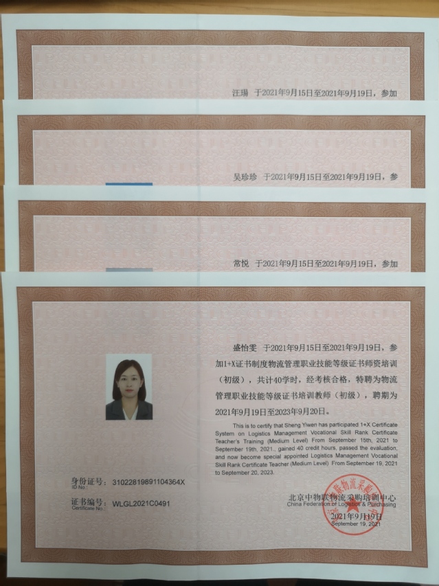 1+X证书制度是职业教育改革的一项重大制度设计,也是职业教育作为类型教育的特色体现,是完善职业教育和培训体系、深化“三教”改革、促进产教融合校企合作的重要抓手。10月18日,经贸科物流组教师吴珍珍、盛怡雯、汪瑒、常悦收到由北京中物联物流采购培训中心颁发的物流管理1+X证书职业技能等级证书培训教师聘书。本次物流管理1+X证书职业技能等级标准(初级)师资能力提升高级研修班是由北京中物联物流采购培训中心主办,由于防控疫情的要求,采用线上学习的方式开展。
