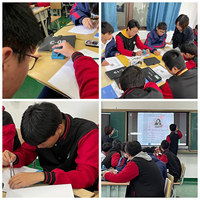 课上,周老师首先复习了所学知识,教师发布任务学生平板答题,答题结果直观地呈现给学生,激发学生学习兴趣。继而采用学生排序组合体三视图画法的方式引出了本次课的课题《组合体模型三视图的绘制》,同时适时渗透了思政教育“中国核潜艇之父黄旭华和他的团队的在研发遇到瓶颈时正是模型给了他们启发才突破了瓶颈”,引出了本次课的任务。接着,学生以6人为一组讨论并制定绘图计划,教师巡回指导,学生展示讨论结果,教师总结评价。学生以2人为一组完成组合体模型三视图绘制,教师巡回指导过程中及时纠正学生绘图过程中的问题,学生展示完成的三视图,教师点评。最后是“三坐标测量”的知识拓展、教师对本次课所学内容的总结和作业布置。本堂课充分体现了以“学生为主体、教师为主导”的课堂,学生学习积极性高、参与度好。