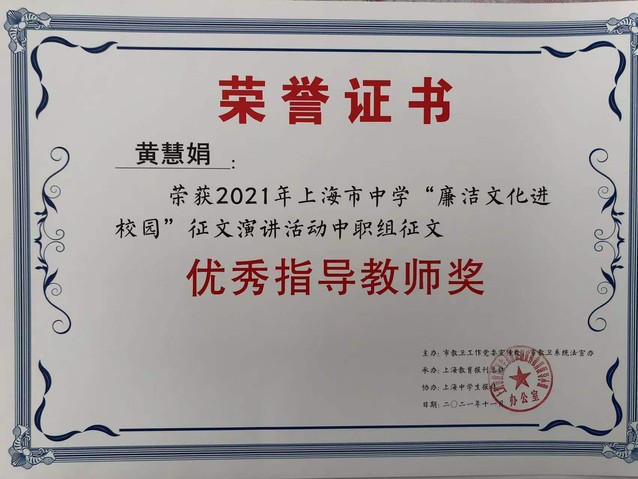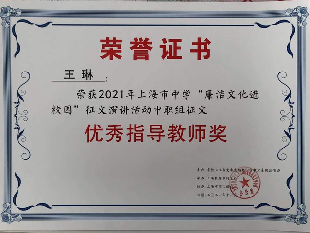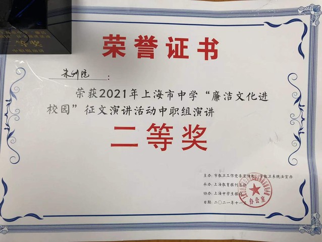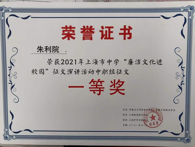 近日喜讯传来,我校学生在2021年上海市中学“廉洁文化进校园”征文演讲活动中获得优异成绩,朱利院、奚冬鑫、朱凌毅三位同学分别获得中职组征文一、二、三等奖。