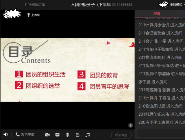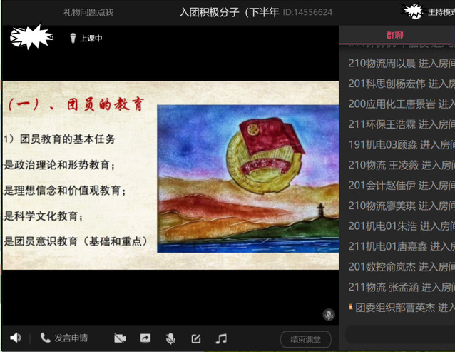 本次团课陈老师围绕着“团员的组织生活”、“团员的教育”、“团组织的选举”和“团员青年的思考”四个方面展开学习。他指出对于一个团员来说教育是至关重要的,团员的意识教育是基础也是主要,要有正确的是非观念,政治立场坚定,有上进心,密切联系群众,在有困难的时候要有团员的身影,以自己的言行影响和带动周围的人共同进步。陈老师希望同学们能学会自律,为未来的国家建设时刻做好准备,在心中厚植家国情怀,培养爱国报国的能力,拥有时不我待的紧迫感、使命感。