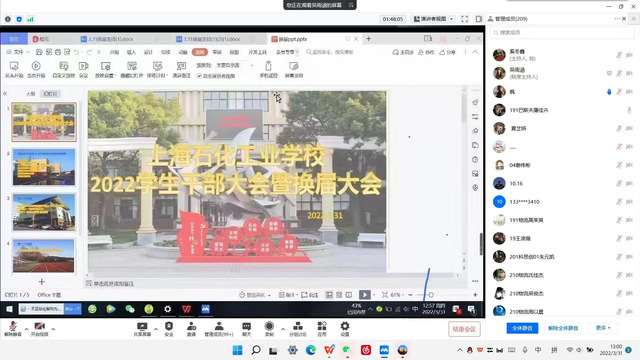 3月31日中午,因疫情原因,上海石化工业学校2022年校、科学生会干部换届大会在线上举行。出席本次会议的人员有化工科党支部书记、学生科长杨立群,机电科学生科长唐辰炜,经贸科学生科长江军花,团委书记彭旭东以及学生会全体成员。