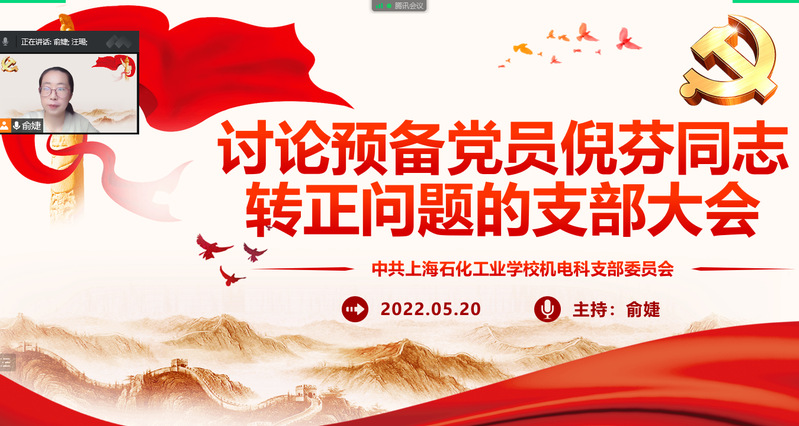 按照《党章》和《中国共产党发展党员工作细则》的规定,根据金山区教育系统2022年上半年预备党员转正工作提示,2022年5月20日,机电科党支部线上召开了预备党员倪芬同志转正大会。本次会议由支部书记俞婕主持,支部15名正式党员及预备党员倪芬同志参加,党委办公室汪瑒老师与会指导。