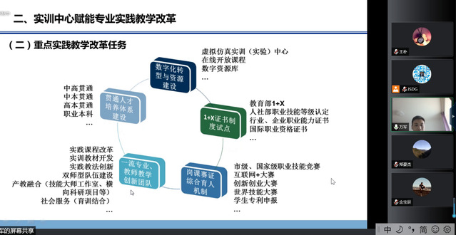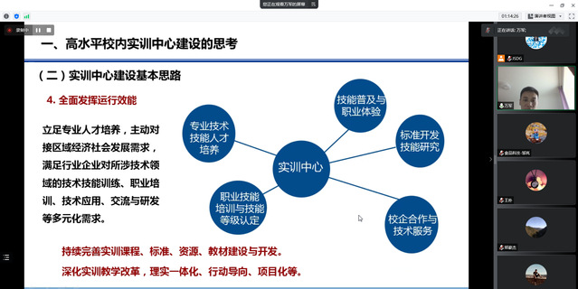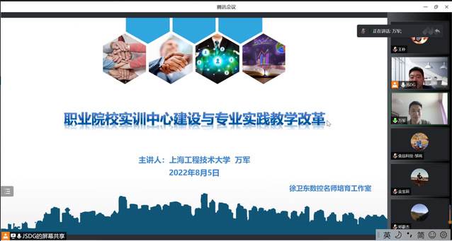 为进一步推动职业院校高水平实训中心建设,创新人才培养模式,提升人才培养质量,2022年8月5日晚上18:00,工作室主持人徐卫东特邀请上海市高级技工学校万军校长开设了“职业院校实训中心建设与专业实践教学改革”线上讲座,上海石化工业学校数控技术应用名师培育工作室主任人徐卫东老师主持,工作室全体学员参加了此次讲座。