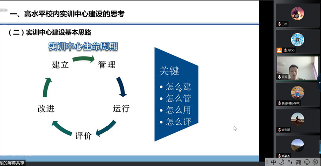 讲座中,万校长结合自己学校数控专业五星级市级开放实训中心建设的情况,围绕“高水平校内实训中心建设的思考”和“实训中心赋能专业实践教学改革”两部分内容,讲授了实训中心的内涵,指出实训中心要在运作形式上强调工位性,在运作上讲究职业性,在教学上强调系统性和可控性,提出了实训中心的八大基本要素,即空间场地、设施设备、规章制度、师资队伍、实训课程、实训教材、运行管理、投入保障。其次,根据实训中心的生命周期,以数控技术专业为例,从系统确立功能定位、科学规划场地布局、合理配置设备设施、全面发挥运行效能、健全运行规章制度、持续建设提升能级等六个方面详细介绍了实训中心建设的基础思路,提出了高水平实训中心的标准。