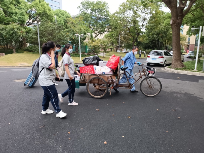 为住宿学生提供安全温馨服务。根据疫情防控的要求,今年开学报到家长不能进校,介于住宿学生物品较多较重,搬运困难很大,并存在很大的安全隐患。为了让家长放心,总务事前制定了详细的住宿生接待任务,当天准备了3辆三轮车作为短途驳运工具,宿舍楼大门口和宿舍楼层内安排了大量的宿管老师和保洁人员引导和帮助学生搬运。家长在校门口看到校方如此周到人性化的服务,一致赞许道“孩子交给这样的学校,我们家长都放心了!”
