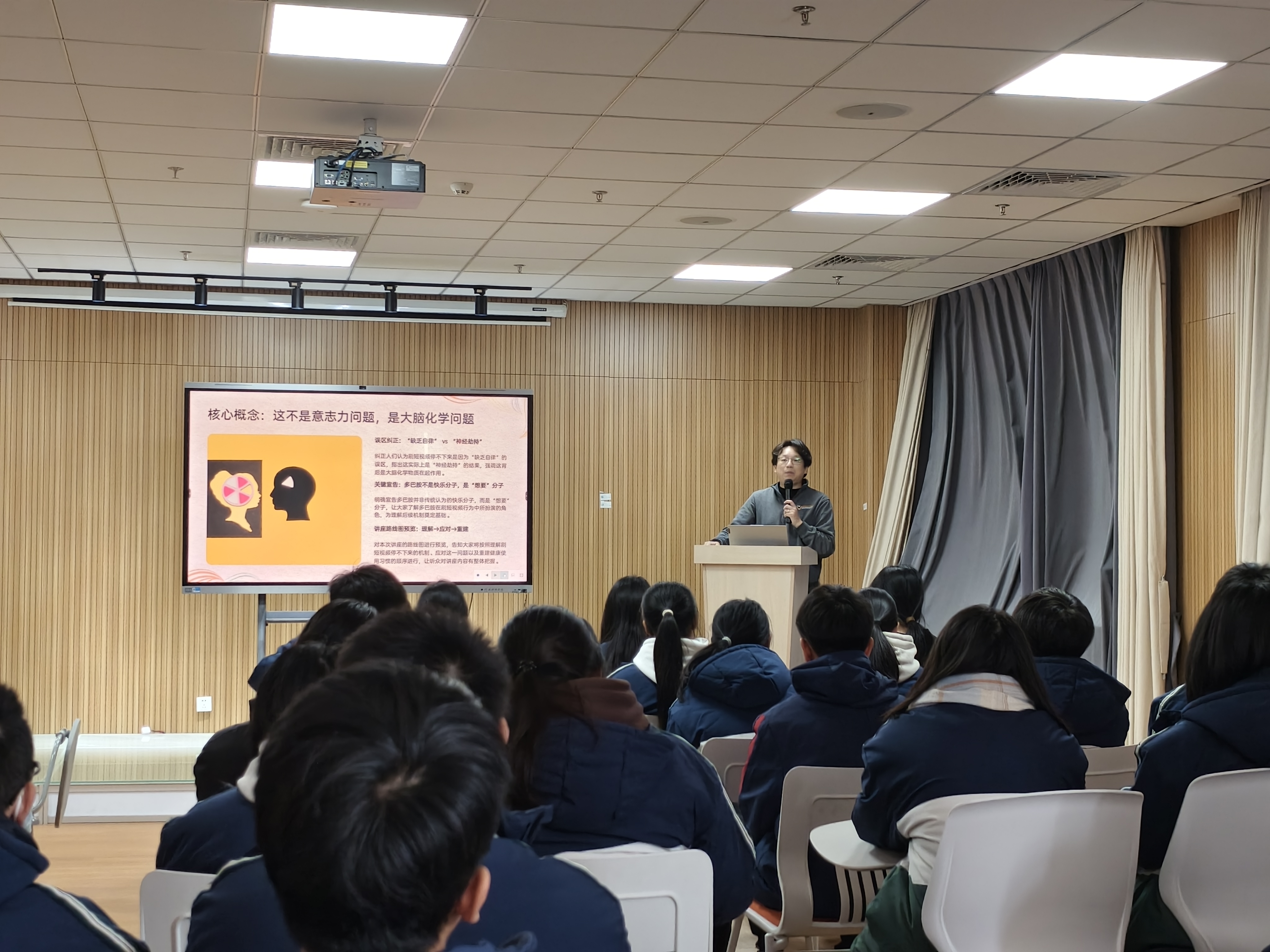 为帮助学子深入理解亲密关系本质、摆脱手机成瘾困境,树立健康行为与情感观念,12月25日我校特邀专业医师仇晓艳、心理讲师顾俊杰开展两场心理健康专题讲座,为同学们的青春成长保驾护航。 在顾俊杰老师主讲的《刷短视频停不下来怎...