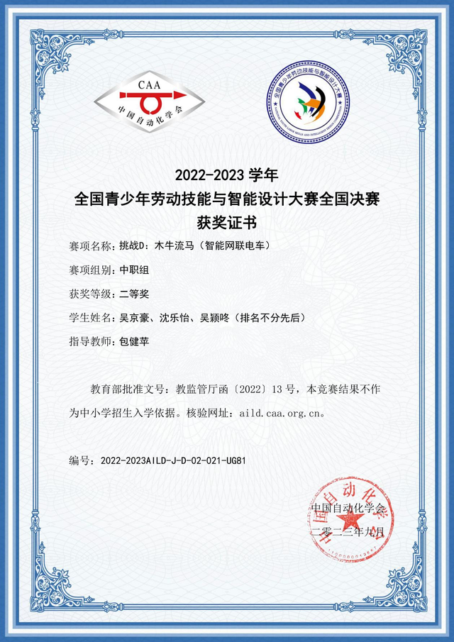 近日喜讯传来,我校学生获得首届全国青少年劳动技能与智能设计大赛二等奖好成绩。本次全国青少年劳动技能与智能设计大赛(简称 AILD)是根据《教育部办公厅关于公布2022-2025学年面向中小学生的全国性竞赛活动的通知》(教监管厅函(2022)13 号)举办的比赛。此项比赛在2023年3月启动,8月末在沈阳举办决赛,来自全国共有7000多名选手参加了此次劳动技能大赛的各个项目的比赛。我校由沈乐怡、吴颖咚、吴京豪三位学生组成的代表队在包健苹老师带领下参赛。