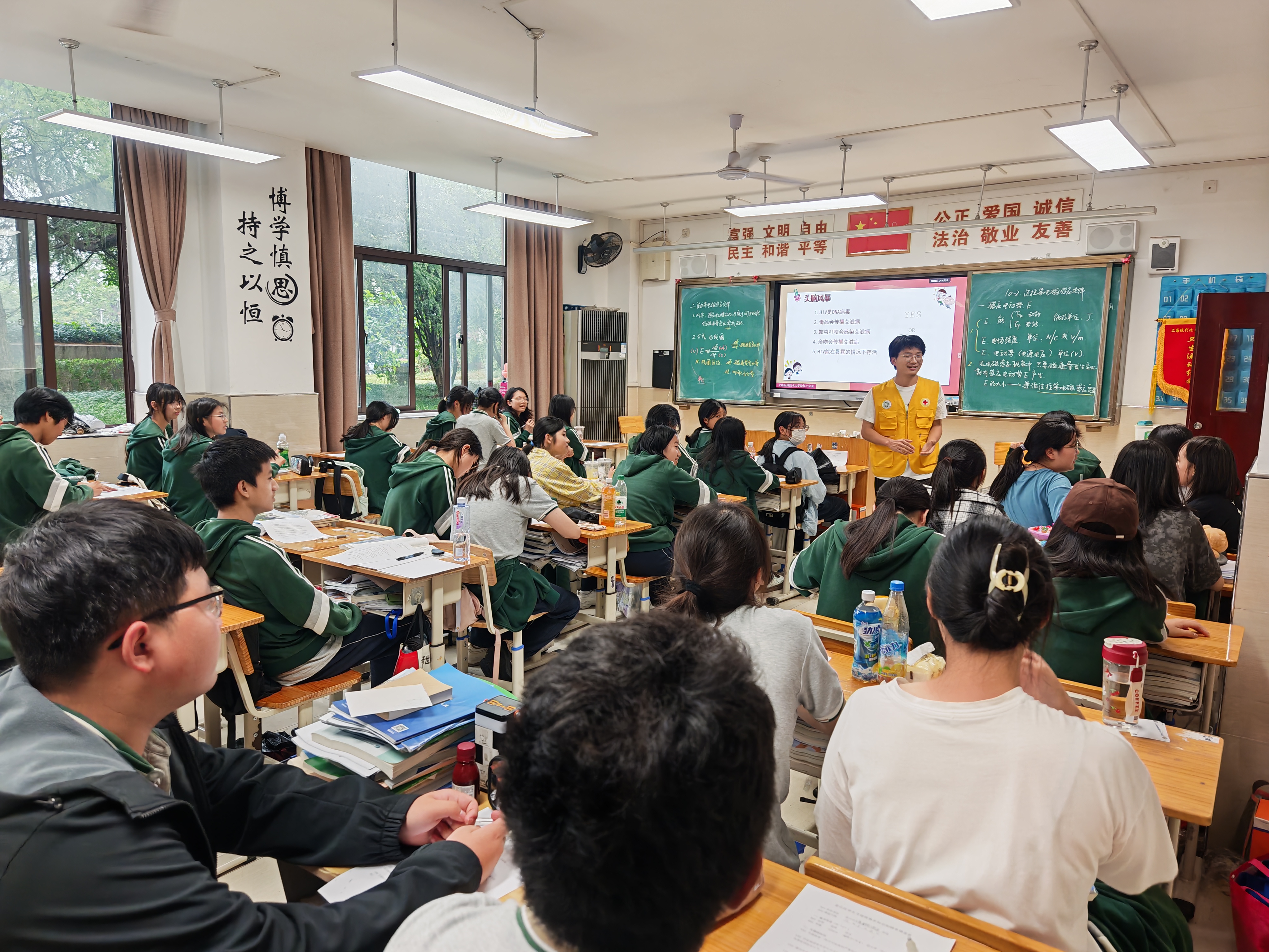 本次活动采用沉浸式课堂的创新形式,来自上海外国语大学的20名大学生志愿者分成10个小组,深入高一年级各班教室开展宣讲。志愿者们通过情景模拟、互动问答、数据可视化展示等方式,向同学们系统讲解了艾滋病传播途径、预防措施及反歧视理念。大学生讲师们用同龄人的语言化解敏感话题,现场气氛活跃。应用化工专业的王同学表示:“学长们用游戏方式讲解知识,让我们记住了'ABC预防原则'和检测渠道信息。”