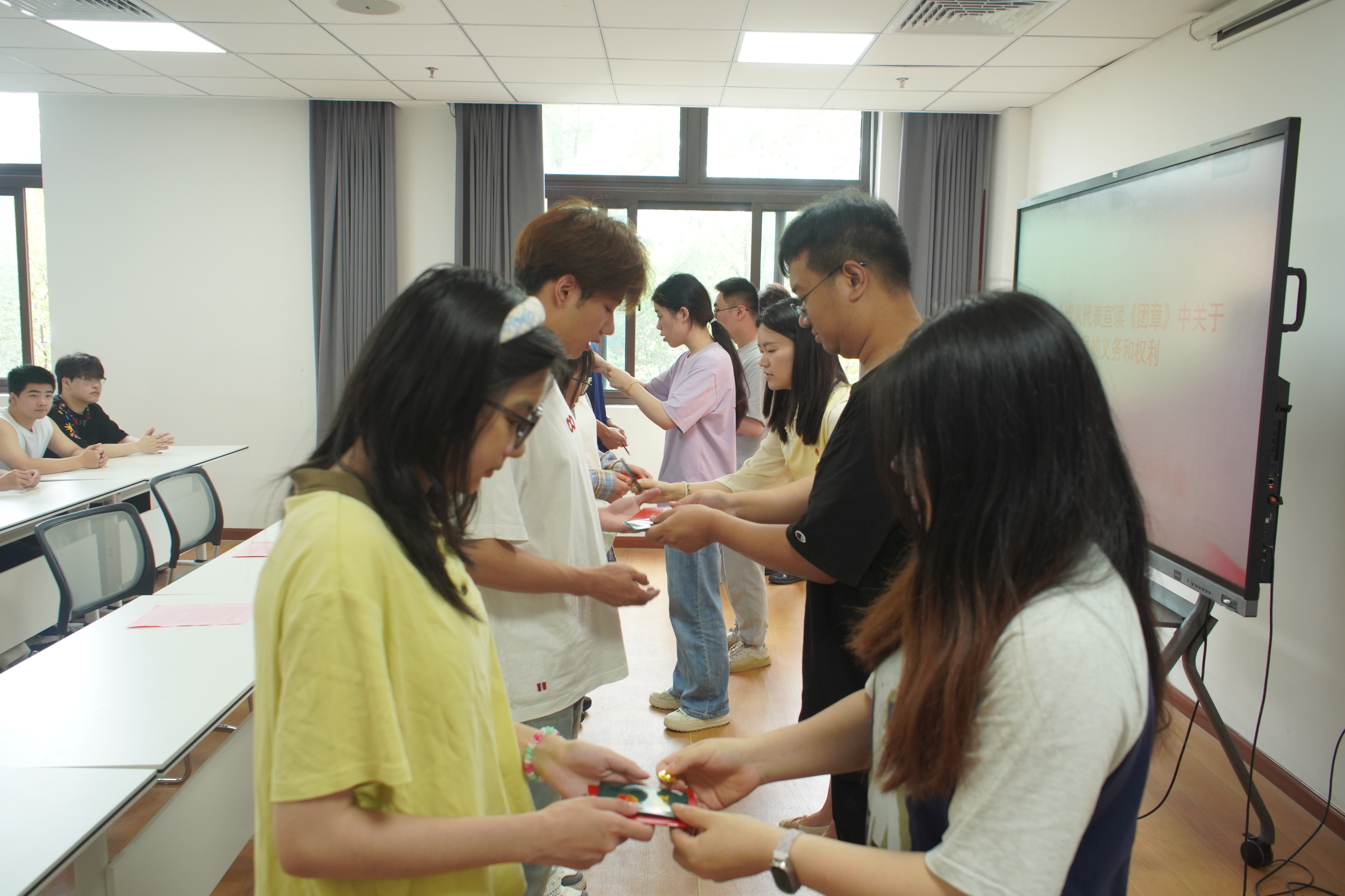 在仪式的重要环节中,校团委班子成员为新团员代表颁发团员证并佩戴团徽。熠熠生辉的团徽承载着组织的信任与期望,激励新团员以更高标准要求自我。