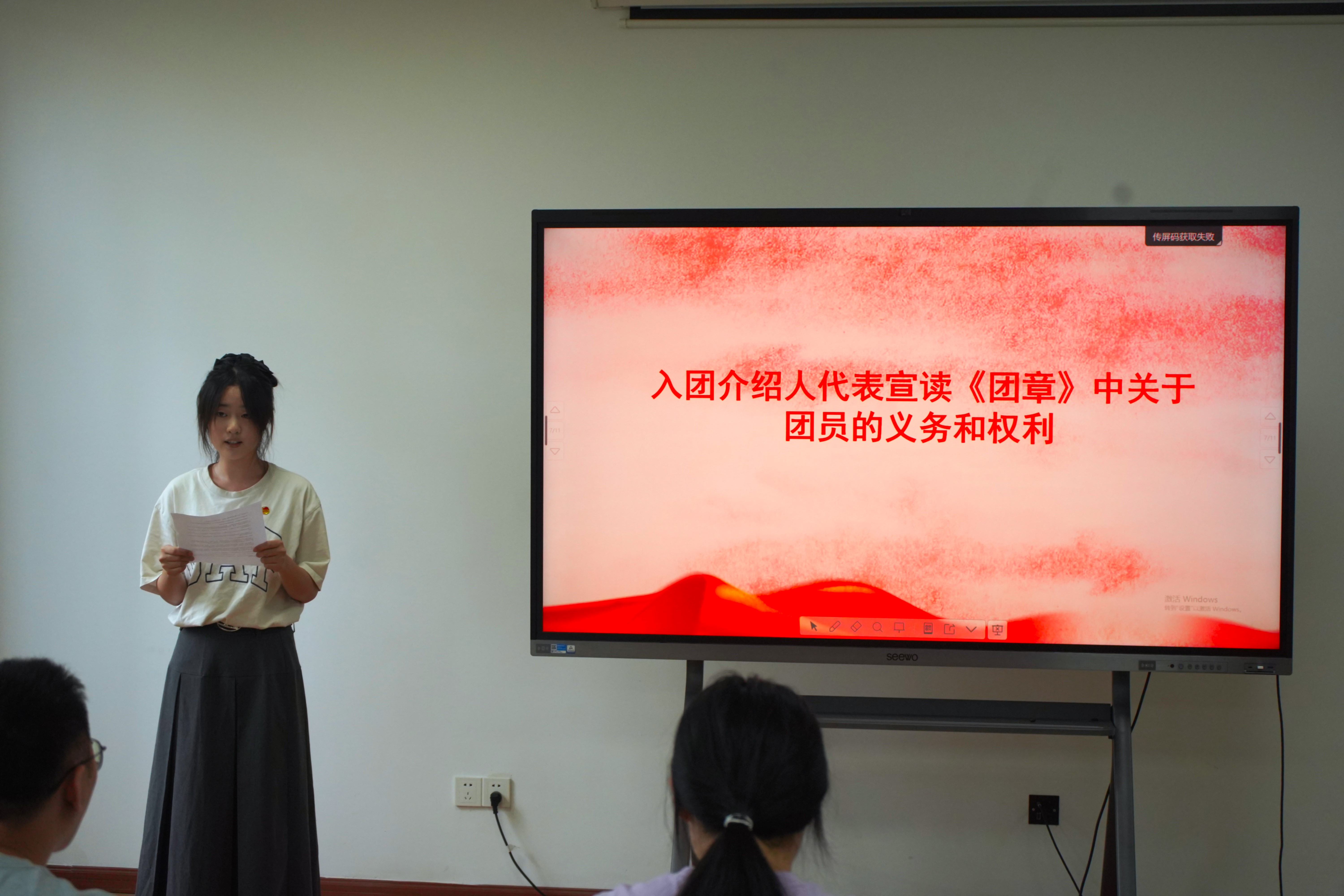 来自240物流班的入团介绍人代表陈紫嫣宣读《团章》中关于团员义务和权利的条款,强调团员应恪守初心、勇担使命。
