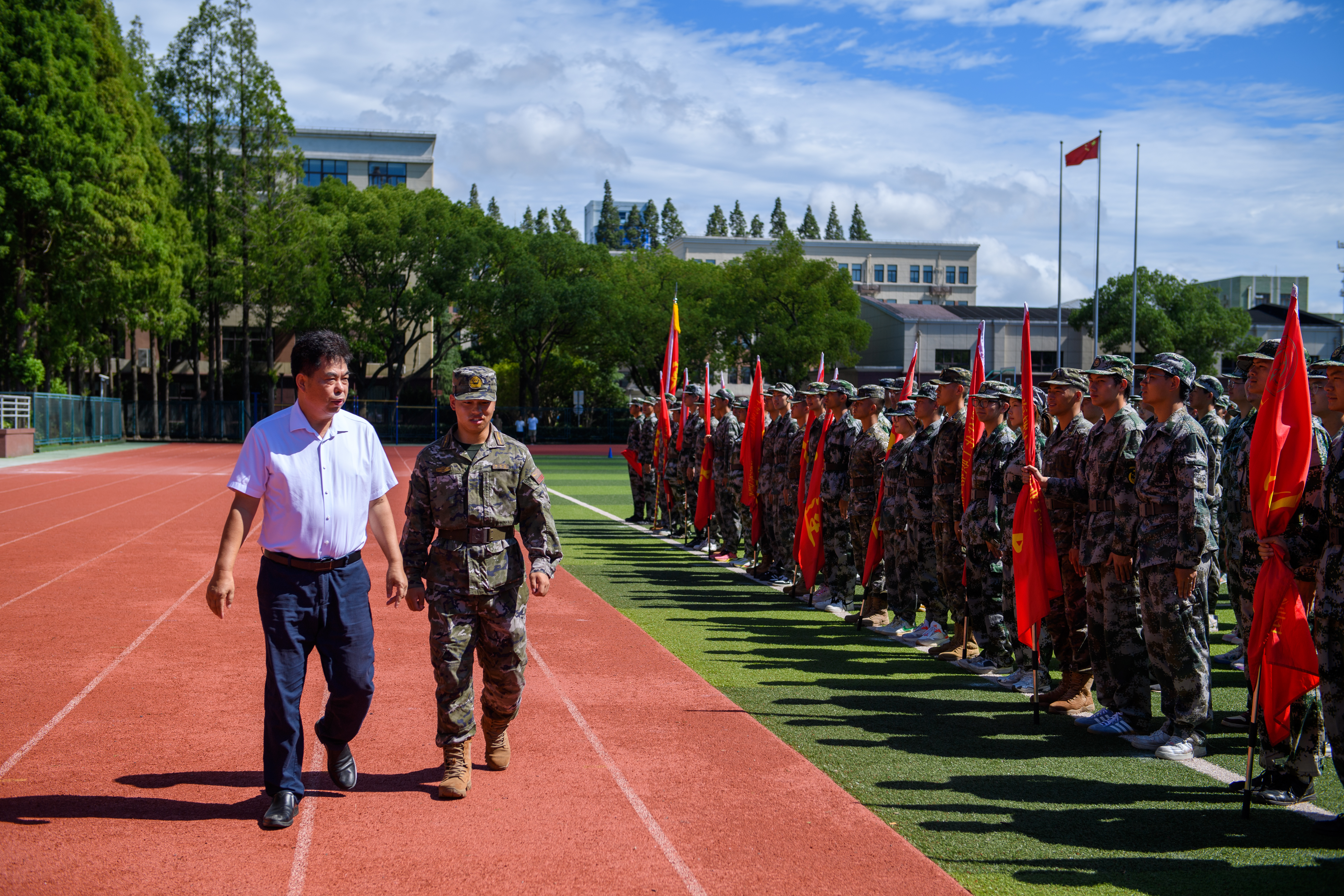7月7日9:00,学校2024级军训结营式在北区操场举行。校长陈晓斌、副校长严小丽等领导出席。