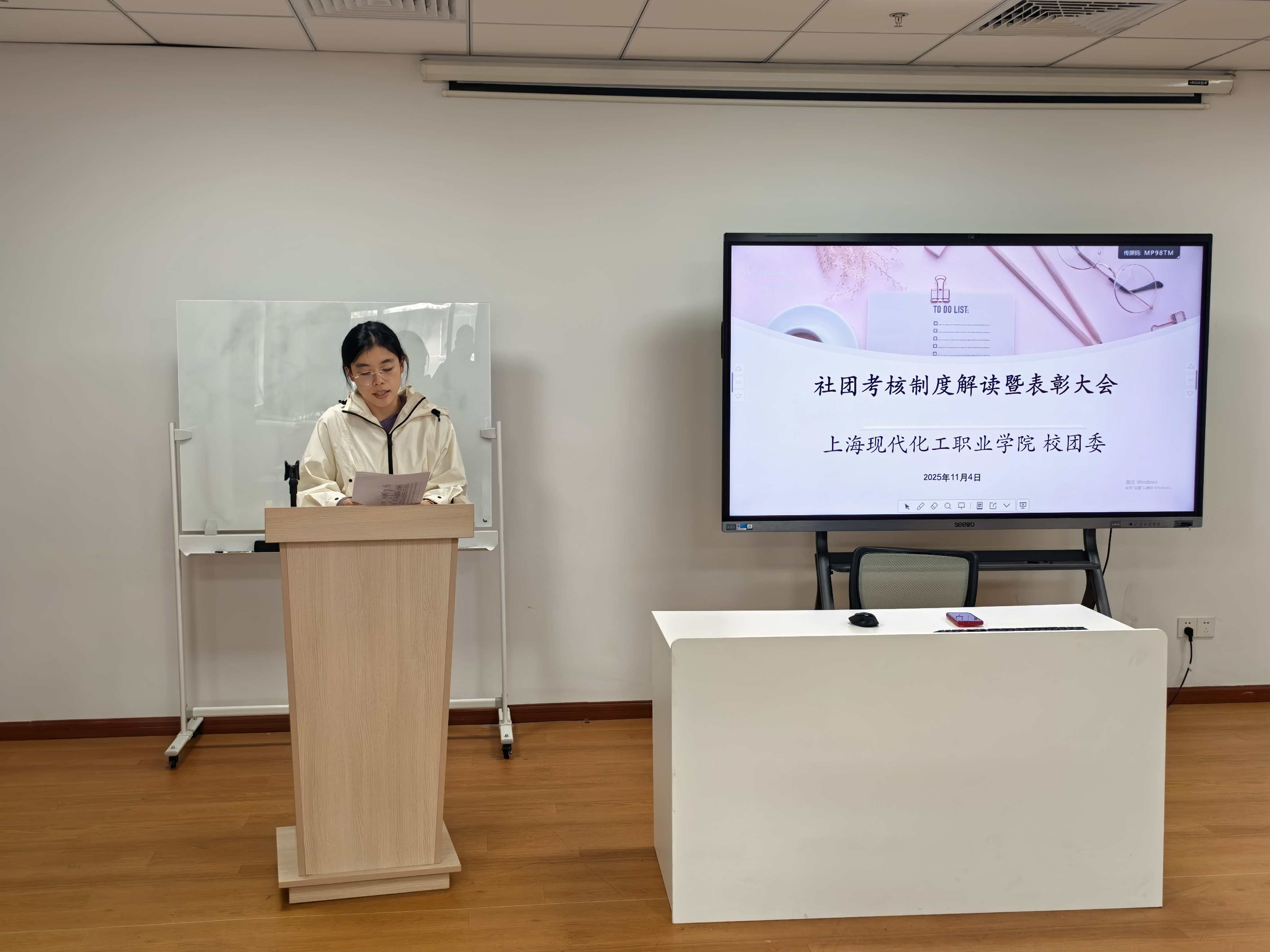 为激发社团新活力,构筑育人新高地,11月7日中午,我校2025-2026-1学期社团考核制度解读暨表彰大会在学生活动中心309举行。校团委书记罗茜出席会议并为获奖教师颁奖,全体社团指导教师齐聚一堂,共同擘画新学期社团发展蓝图。会议由团委副书记薛名君主持。