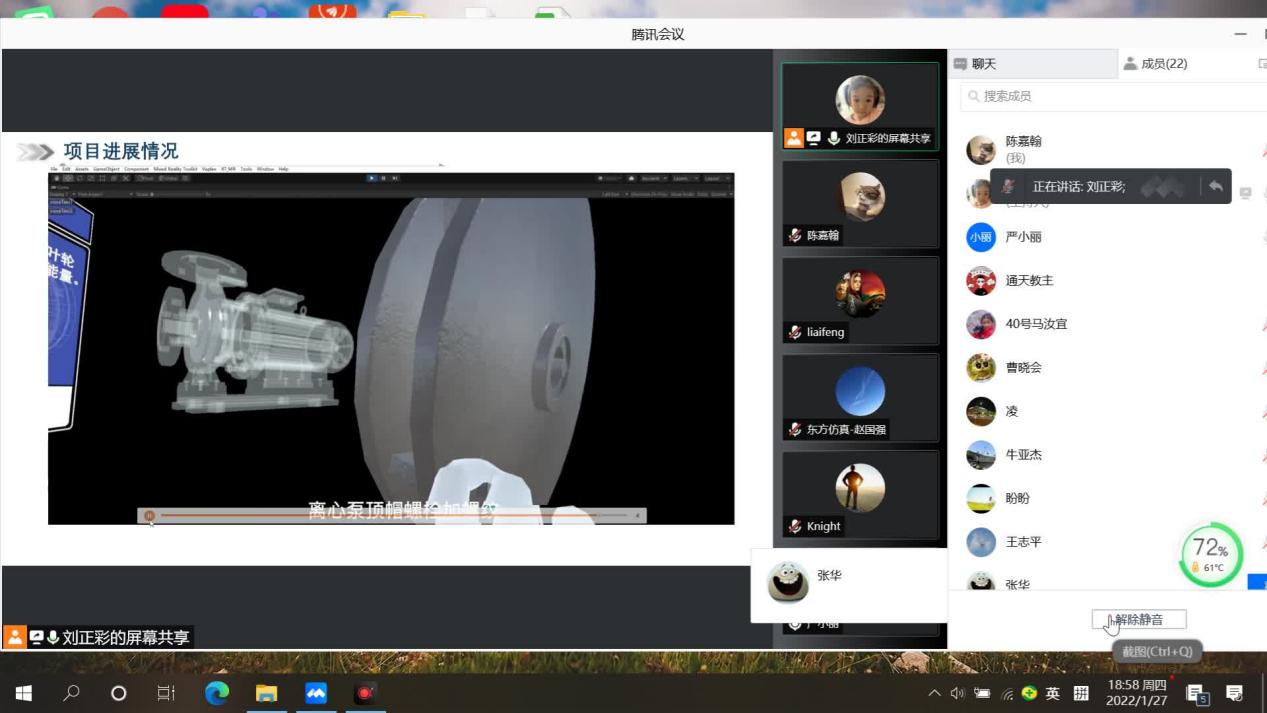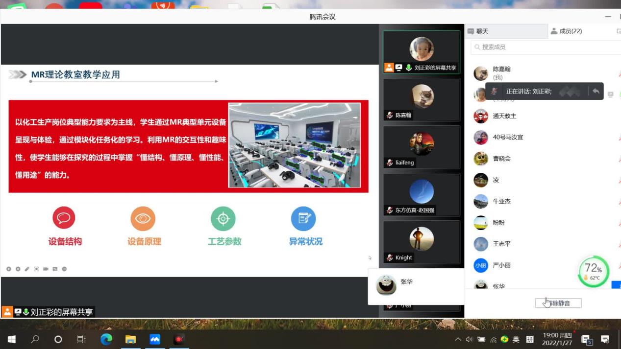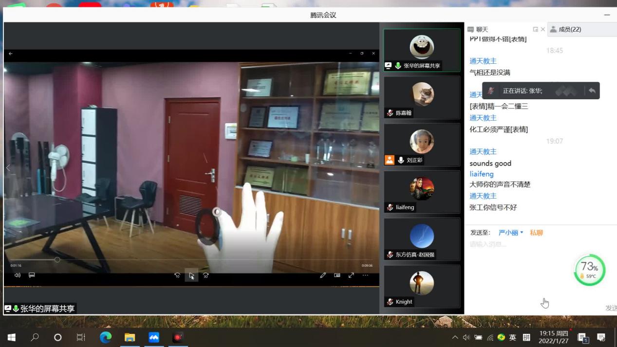 东方仿真技术人员刘正彩从整体情况、具体进展、后续计划以及应用场景四个方面对目前虚拟仿真技术开发模块进行了汇报。刘正彩指出根据专家对本模块提出的完善建议,目前已完成了三十多项的修改,还有十二项计划在年后完成。俞亮专家提出,精馏塔展示部分,气相没有完全充满整个结构的问题。张列维专家指出整个结构中某一部件的位置应该使用特殊标记如光环等方式显示出来,便于学生学习,另外关于螺栓的选取,应该按照实际选取双头螺栓。严小丽指出,MR视角中的结构画面应该可以呈现各个零部件,另外系统中语音、文字以及讲解内容都应该完美匹配。张华专家结合东方仿真提供的测试视频提出很多细节上的提升问题,包括目前所有的圆形都是以多边形的形式展现出来的,缺少装配图以及机械密封的结构出现错误等。东方仿真的人员表示会一一记录问题并解决。