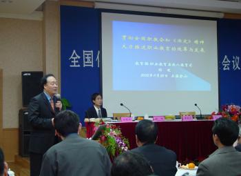 11月25日,全国化工职业技术教育院校长会议在我校多功能厅举行。教育部杨进处长、中国化工教育协会理事长熊传勤、化工出版社社长兼党委书记俸培宗、上海市教委职成教正处级调研员戴小芙、上海市金山区教育局局长徐虹、上海石化工业学校校长兼党委书记过维义及来自全国化工职业技术院校近百名校长参加了会议。在各位领导相续发言后,杨进处长针对目前的职业技术教育状况作了精彩的报告。