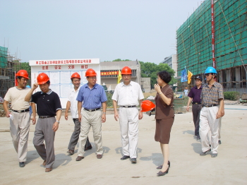 7月31日下午,金山区副区长叶汝强、金山区教育局局长徐虹、副局长林乃华等领导来我校南区工地视察。    在校党委副书记熊海滨、工会主席张伟的陪同下,叶副区长及教育局领导亲自将防暑慰问品送到工人们的手中,并嘱咐他们一定要注意安全。随后他们还视察了在建设中的拜耳实训基地。
