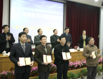 3月14日下午,上海市中等职业学校“职业道德教育与城市的明天”校长论坛成果交流暨颁奖会假座上海南湖职校报告厅召开。颁奖仪式由教委职成教处副处长王向群主持,市教委、市中小学幼儿教师奖励基金会及市职成教研究所的有关领导出席本次会议。    本次论坛从去年3月起征文,历时一年,经过初赛和复赛的层层选拔,我校过维义校长演讲的《校企携手,托起明天的太阳》受到专家们的好评,最终脱颖而出,荣获二等奖,并在颁奖会上作大会交流。市职成教研究所所长马树超对本次论坛作了精彩的点评,市教委职成教处处长张持刚作重要讲话。
