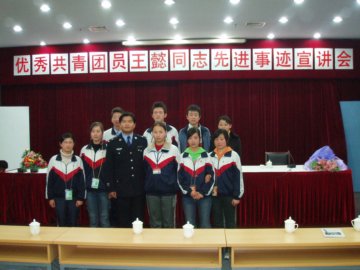 王懿同志是公安金山分局特警大队的一名普通团员,在2006123日晚,为了阻止漕泾一名持械精神病患者,头部多处受伤。王懿同志的英勇行为得到了各方的关注,从一个平凡共青团员的身上,我们发现了他的闪光点。宣讲会上王懿的领导、战友、女友、母亲都分别为我们介绍了王懿同志的事迹,从他的平时生活、工作中其实已经足以说明他是一名优秀的青年。而他在执行任务中所表现的对党的忠诚和对人民的负责,更让人钦佩。他常说的一句话就是“穿上这身警服,就不再代表个人,而是代表人民警察的形象。”这句话和他的事迹深深地感染了在场的每一位团员青年。