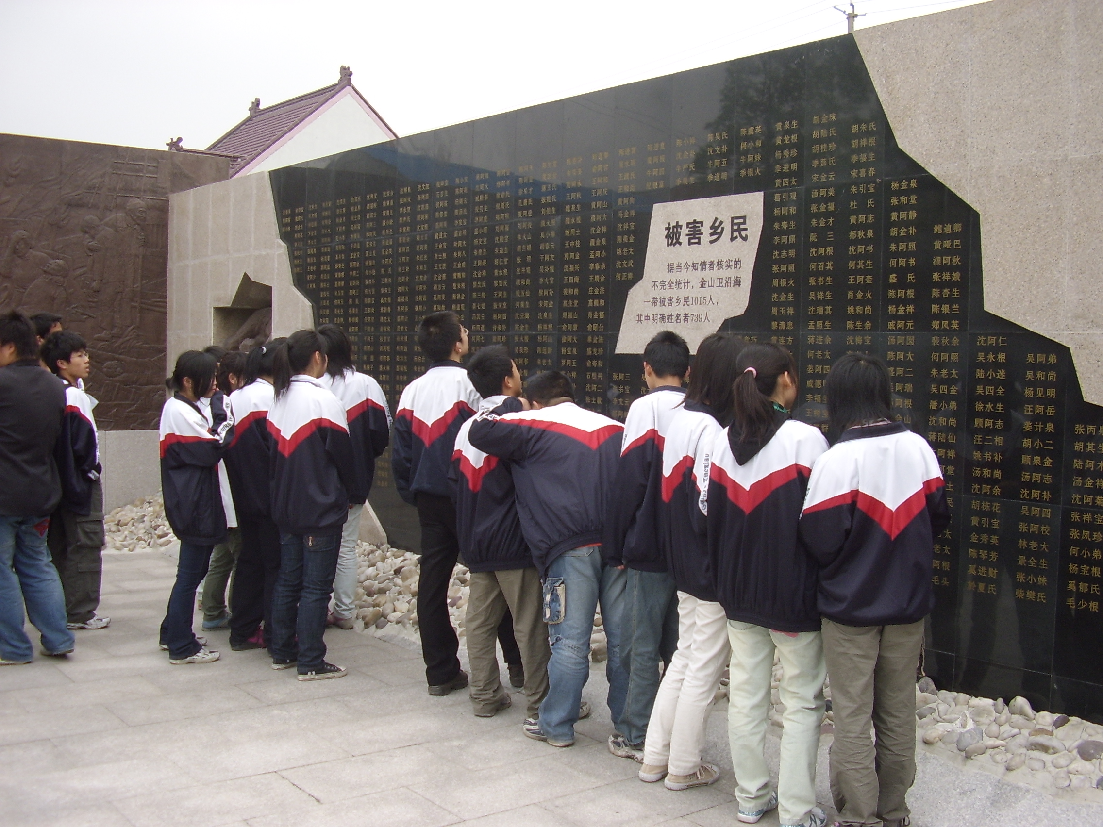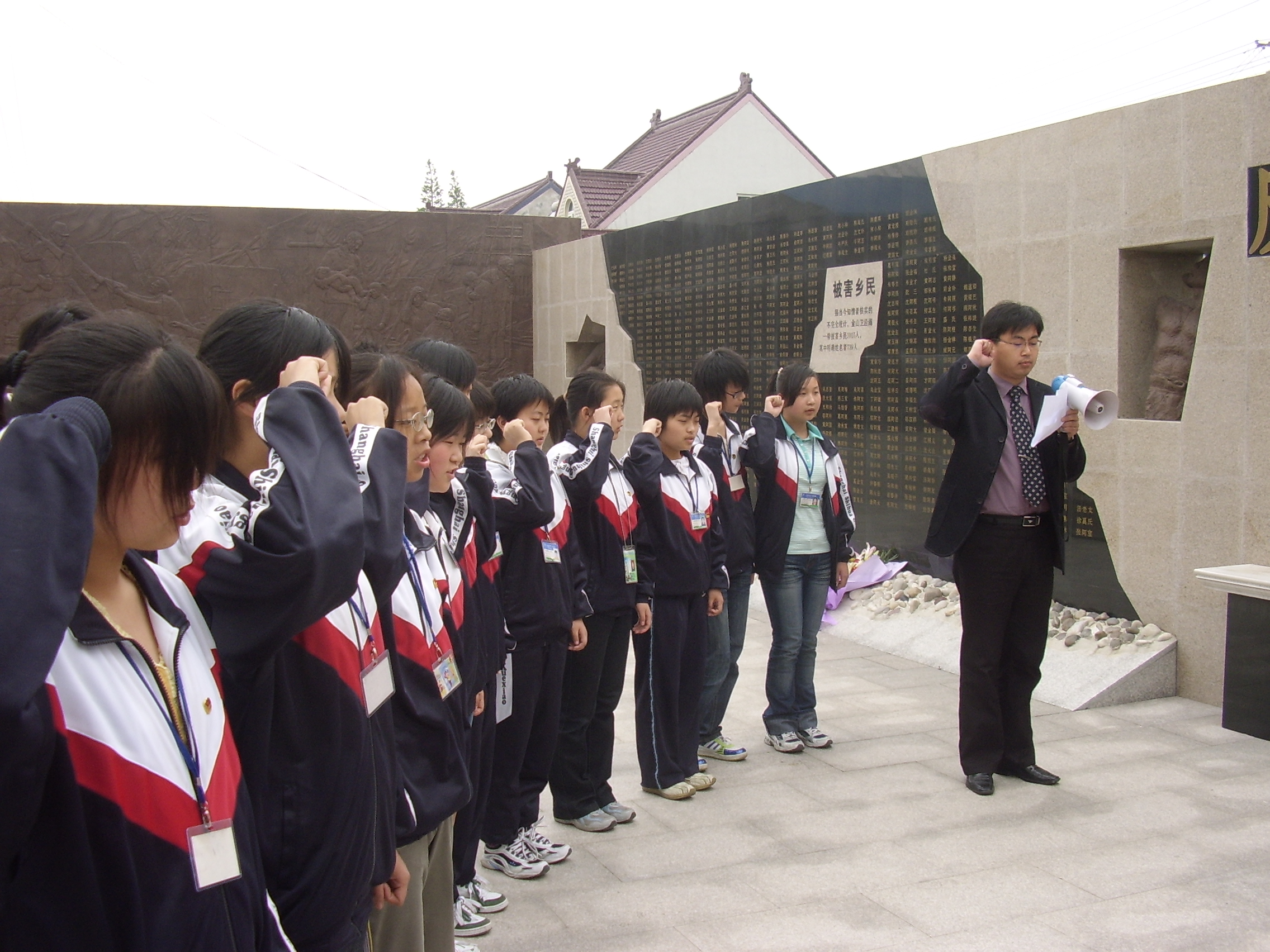 为了配合学校全面开展“两纲”教育活动,教育学生不忘历史,唤起学生们的民族热情和爱国主义精神。05教改辅导三组的学生在组长汪伟东老师的带领下,于2006年4月26日来到金山卫侵华日军登陆处遗址纪念地举行了以“缅怀先烈,发愤图强”为主题的民族教育活动及新团员宣誓活动。